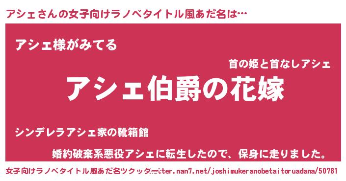 | 男性向けラノベタイトル風あだ名 | 『やはりアシェの青春ラブコメはまちがっている 』 |