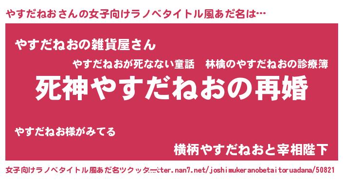 | 男性向けラノベタイトル風あだ名 | 『ノーゲーム・ノーヤスダネオ』 |