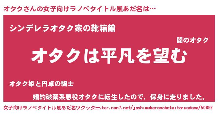 | 胡散臭い通販商品みたいなあだ名 | 『信頼と実績のサプリメント…その名も「オタク」』 |