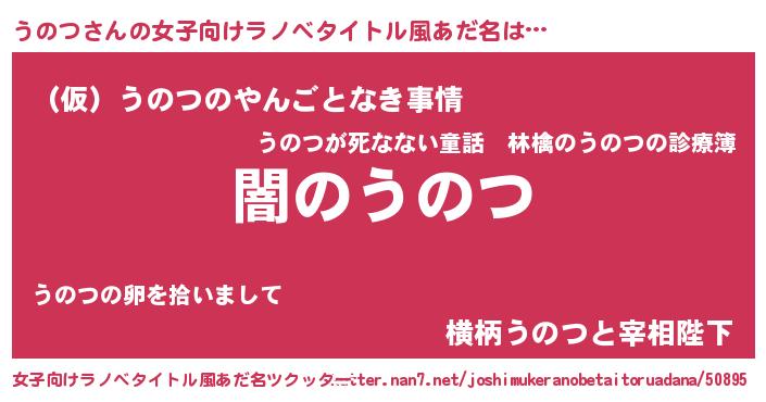 | 男性向けラノベタイトル風あだ名 | 『Re:うのつから始める異世界生活』 |