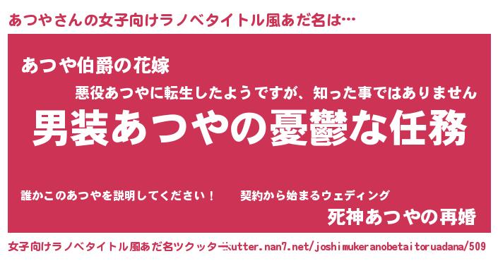 | 男性向けラノベタイトル風あだ名 | 『うちのあつやが世界を掌握している!』 |