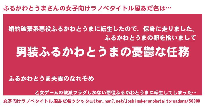 | 男性向けラノベタイトル風あだ名 | 『冴えないふるかわとうまの育てかた』 |
