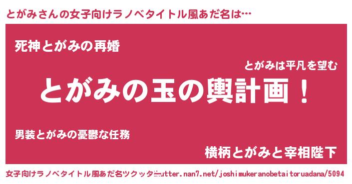 | 男性向けラノベタイトル風あだ名 | 『転生したらとがみだった件』 |