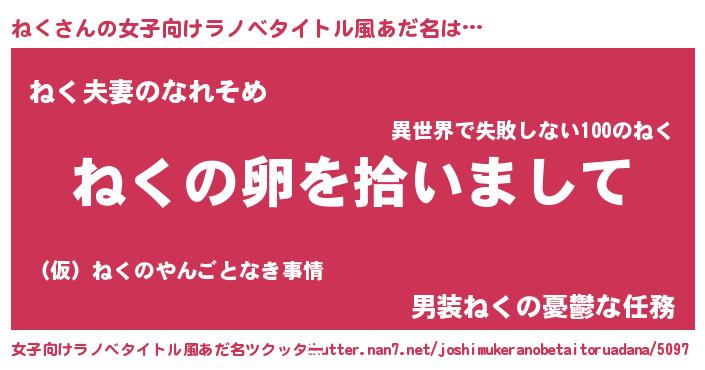 ねくさんの女子向けラノベタイトル風あだ名は… 『ねくの卵を拾いまして』『ねく夫妻のなれそめ』『男装ねくの憂鬱な任務』 ツクッター #女子向けラノベタイトル風あだ名ツクッター http://tkutter.nan7.net/joshimukeranobetaitoruadana/5097/