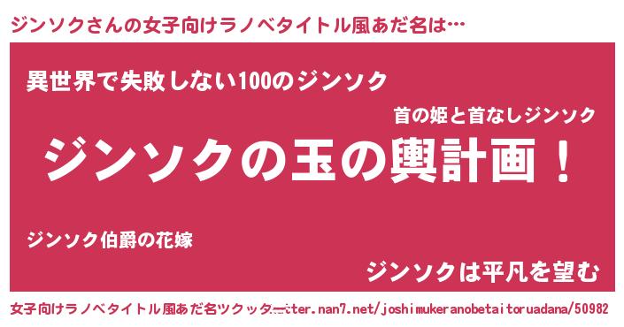 | 男性向けラノベタイトル風あだ名 | 『ジンソク~年齢イコール彼女いない歴の魔法使い~』 |