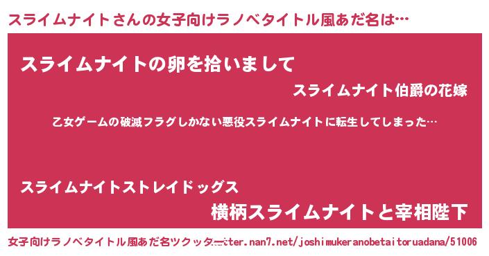 | 意味不明あだ名 | 『住所不定無職スライムナイト(13歳)』 |