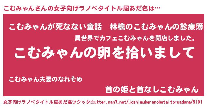 | 男性向けラノベタイトル風あだ名 | 『こむみゃんの嫁は女の子じゃないと思った?』 |