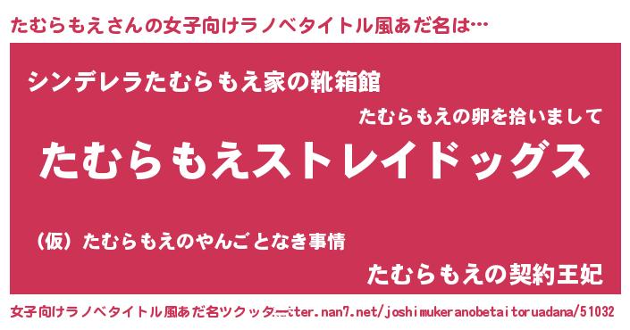 | 男性向けラノベタイトル風あだ名 | 『Re:たむらもえから始める異世界生活』 |