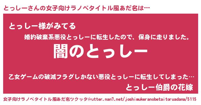 とっしーさんの女子向けラノベタイトル風あだ名は… 『闇のとっしー』『とっしー様がみてる』『とっしー伯爵の花嫁』 ツクッター #女子向けラノベタイトル風あだ名ツクッター http://tkutter.nan7.net/joshimukeranobetaitoruadana/5115/