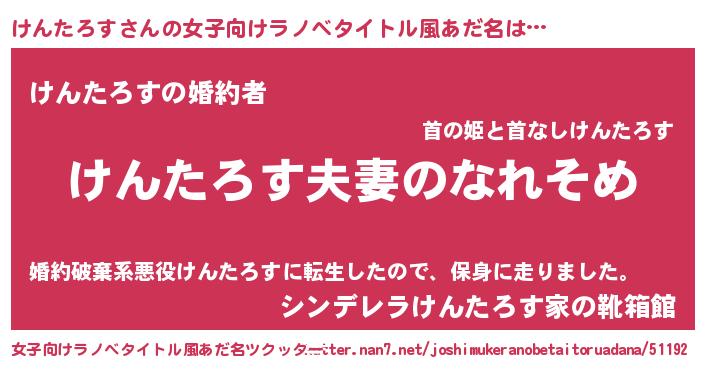 | 男性向けラノベタイトル風あだ名 | 『おまえをオタクにしてやるから、俺をけんたろすにしてくれ! 』 |