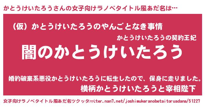 | ヘコむあだ名 | 『かとにー』『かとうけいたろう(笑)』 |