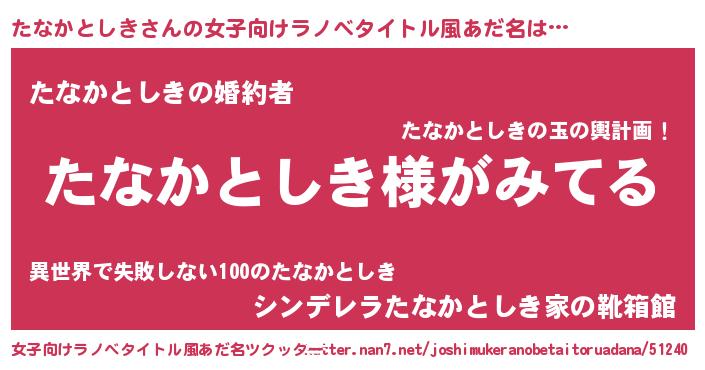 | 男性向けラノベタイトル風あだ名 | 『たなかとしきの嫁は女の子じゃないと思った?』 |
