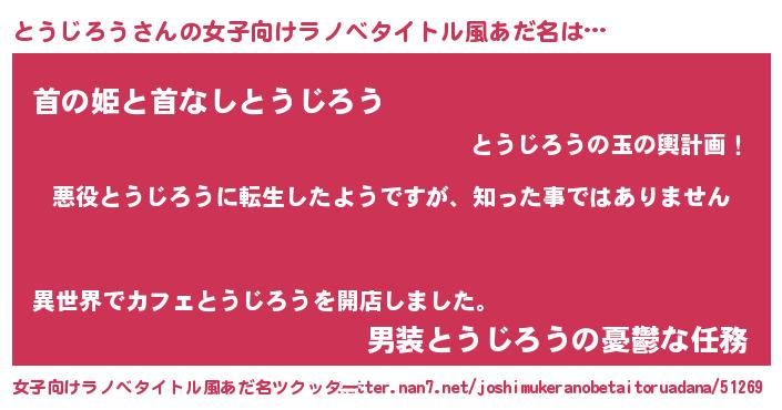 | 男性向けラノベタイトル風あだ名 | 『この素晴らしい世界にとうじろうを!』 |