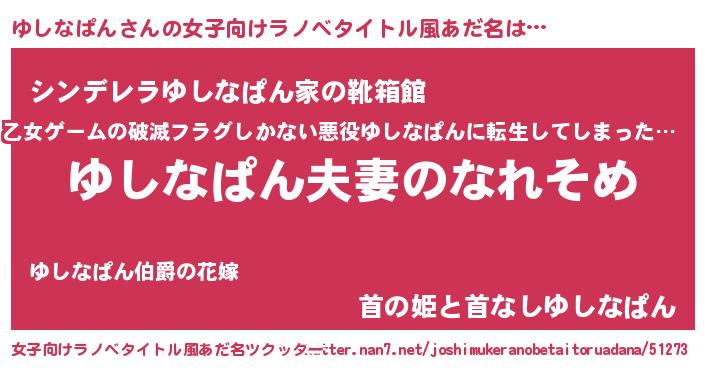 | 男性向けラノベタイトル風あだ名 | 『おまえをオタクにしてやるから、俺をゆしなぱんにしてくれ! 』 |