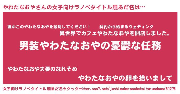 | 男性向けラノベタイトル風あだ名 | 『うちのやわたなおやが世界を掌握している!』 |