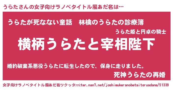 | 男性向けラノベタイトル風あだ名 | 『うらたに滅ぼされるだけの簡単なお仕事です』 |