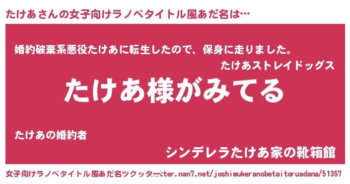 | 男性向けラノベタイトル風あだ名 | 『たけあの嫁は女の子じゃないと思った?』 |
