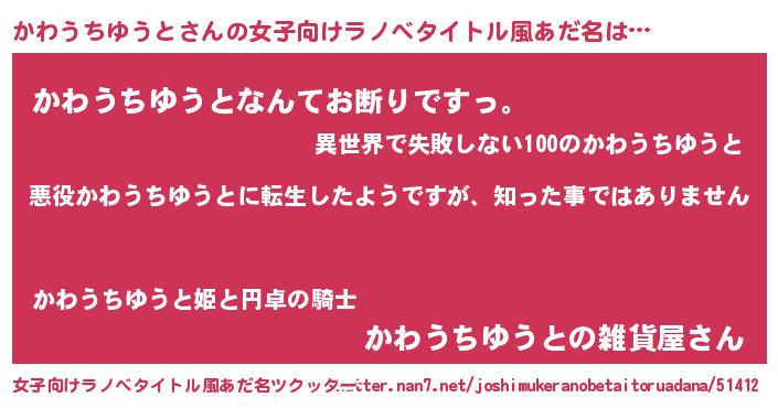 | 胡散臭い通販商品みたいなあだ名 | 『あなたにだけ特別に提供する100年もののヴィンテージワイン…その名も「かわうちゆうと」』 |