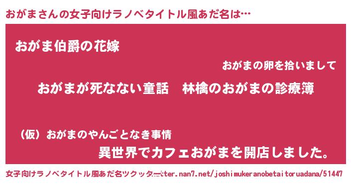 | 男性向けラノベタイトル風あだ名 | 『魔弾の王とおがま』『おがまの憂鬱』 |