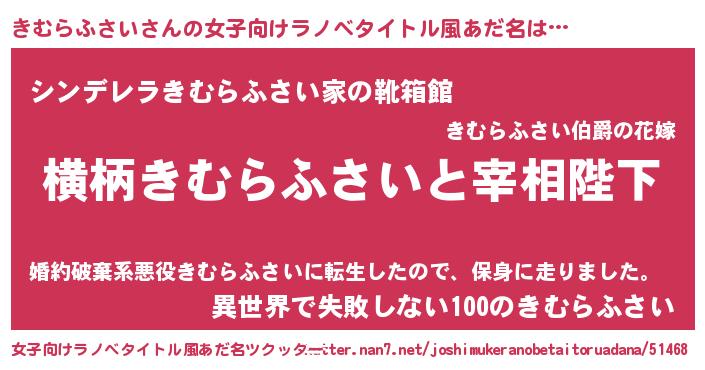 きむらふさいさんの女子向けラノベタイトル風あだ名は… 『横柄きむらふさいと宰相陛下』『シンデレラきむらふさい家の靴箱館』『異世界で失敗しない100のきむらふさい』 ツクッター #女子向けラノベタイトル風あだ名ツクッター http://tkutter.nan7.net/joshimukeranobetaitoruadana/51468/