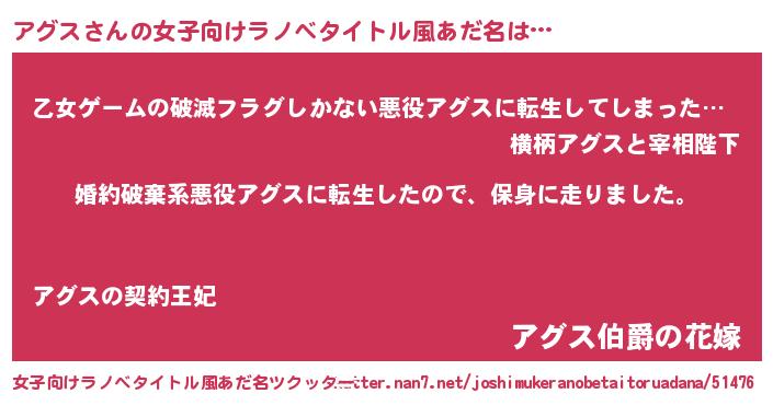 | 男性向けラノベタイトル風あだ名 | 『転生したらアグスだった件』 |