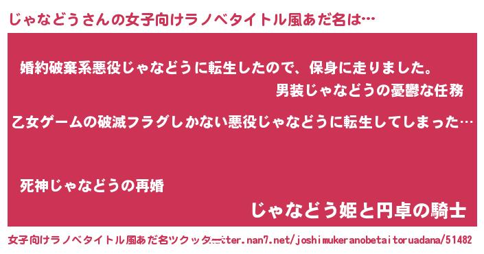 | 男性向けラノベタイトル風あだ名 | 『この素晴らしい世界にじゃなどうを!』 |