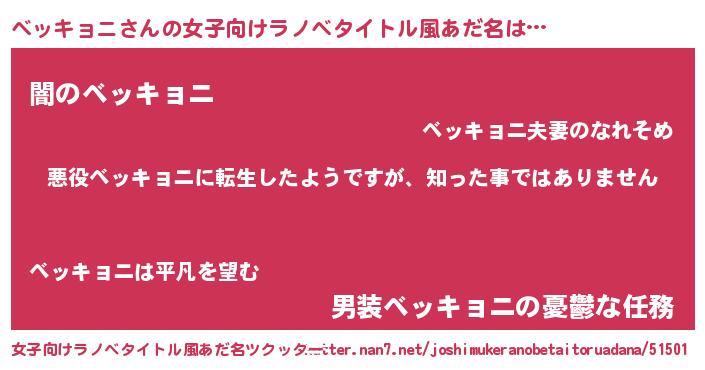 | 男性向けラノベタイトル風あだ名 | 『この素晴らしい世界にベッキョニを!』 |