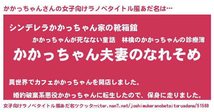 | 男性向けラノベタイトル風あだ名 | 『おまえをオタクにしてやるから、俺をかかっちゃんにしてくれ! 』 |