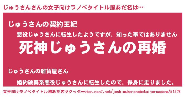 | 男性向けラノベタイトル風あだ名 | 『ノーゲーム・ノージュウサン』 |