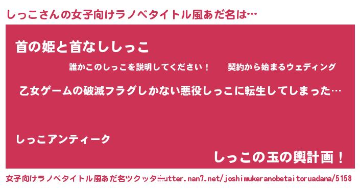 しっこさんの女子向けラノベタイトル風あだ名は… 『乙女ゲームの破滅フラグしかない悪役しっこに転生してしまった…』『首の姫と首なししっこ』『しっこの玉の輿計画!』 ツクッター #女子向けラノベタイトル風あだ名ツクッター http://tkutter.nan7.net/joshimukeranobetaitoruadana/5158/