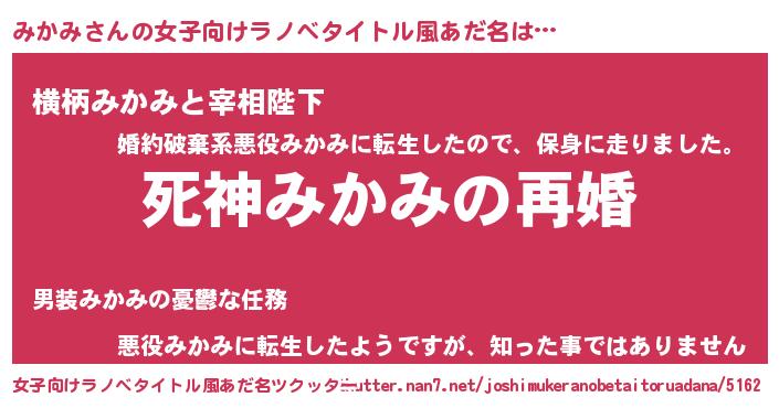 | 男性向けラノベタイトル風あだ名 | 『ノーゲーム・ノーミカミ』 |