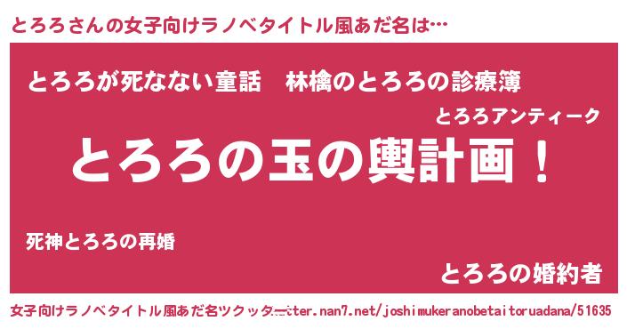 | 男性向けラノベタイトル風あだ名 | 『とろろ~年齢イコール彼女いない歴の魔法使い~』 |