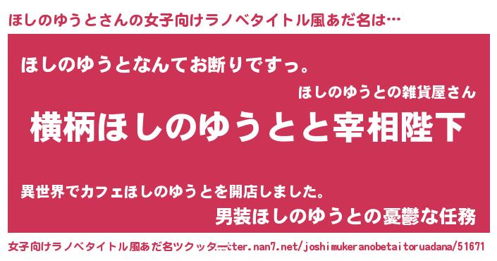 | 男性向けラノベタイトル風あだ名 | 『ほしのゆうとに滅ぼされるだけの簡単なお仕事です』 |