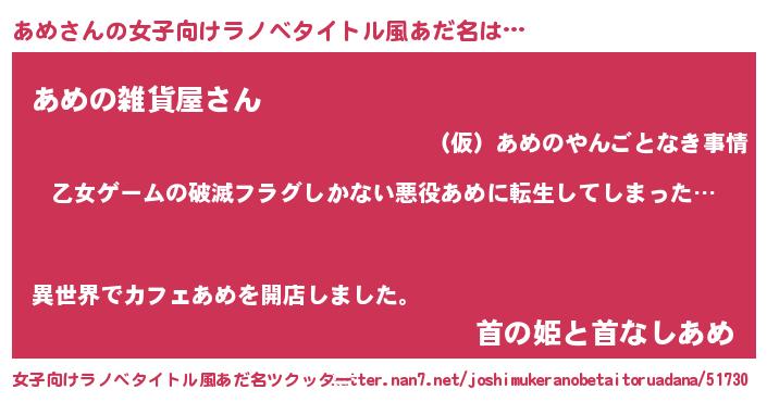| 男性向けラノベタイトル風あだ名 | 『魔弾の王とあめ』『はたらくあめさま!』 |
