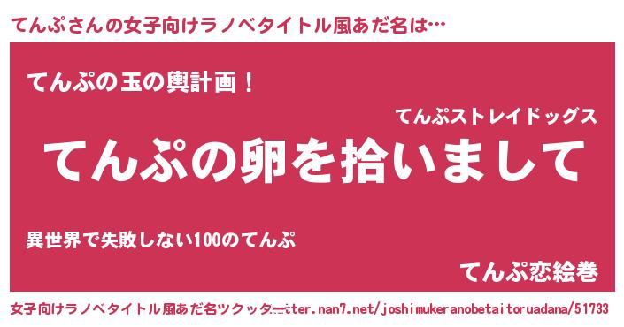 | 男性向けラノベタイトル風あだ名 | 『てんぷの嫁は女の子じゃないと思った?』 |