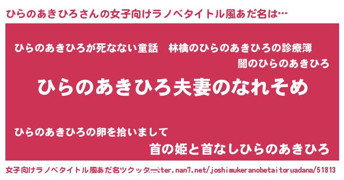 | 男性向けラノベタイトル風あだ名 | 『おまえをオタクにしてやるから、俺をひらのあきひろにしてくれ! 』 |