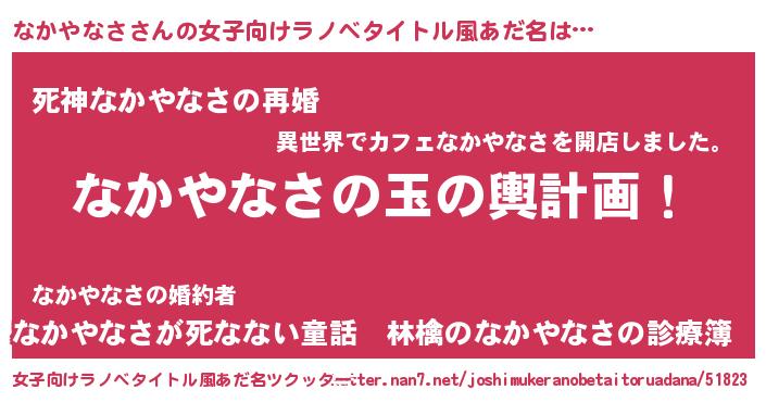 | 男性向けラノベタイトル風あだ名 | 『なかやなさ~年齢イコール彼女いない歴の魔法使い~』 |
