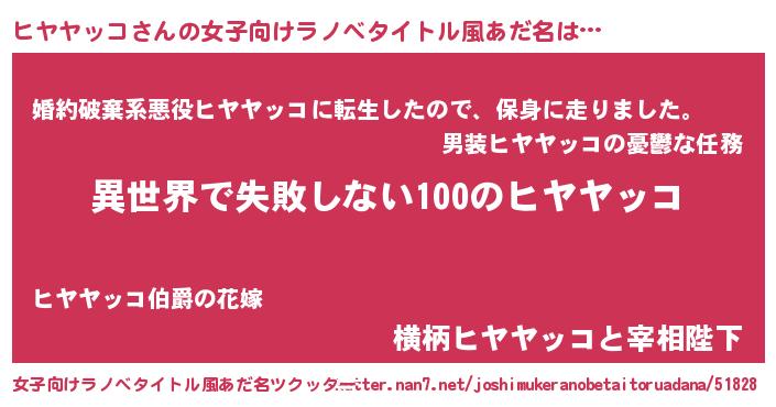 | 男性向けラノベタイトル風あだ名 | 『ヒヤヤッコという概念が存在しない退屈な世界 』 |