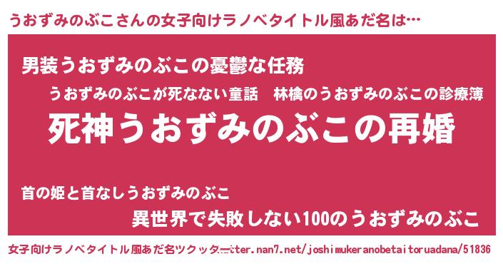 うおずみのぶこさんの女子向けラノベタイトル風あだ名は… 『死神うおずみのぶこの再婚』『男装うおずみのぶこの憂鬱な任務』『異世界で失敗しない100のうおずみのぶこ』 ツクッター #女子向けラノベタイトル風あだ名ツクッター http://tkutter.nan7.net/joshimukeranobetaitoruadana/51836/