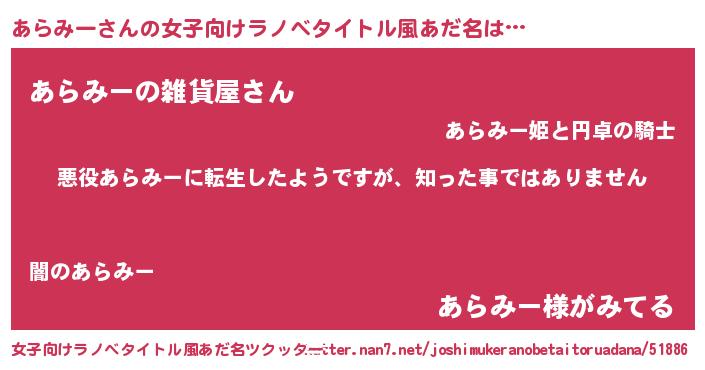 | 男性向けラノベタイトル風あだ名 | 『この素晴らしい世界にあらみーを!』 |