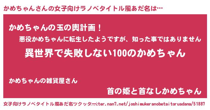 | 男性向けラノベタイトル風あだ名 | 『かめちゃんという概念が存在しない退屈な世界 』 |