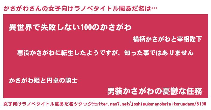 | 男性向けラノベタイトル風あだ名 | 『この素晴らしい世界にかさがわを!』 |