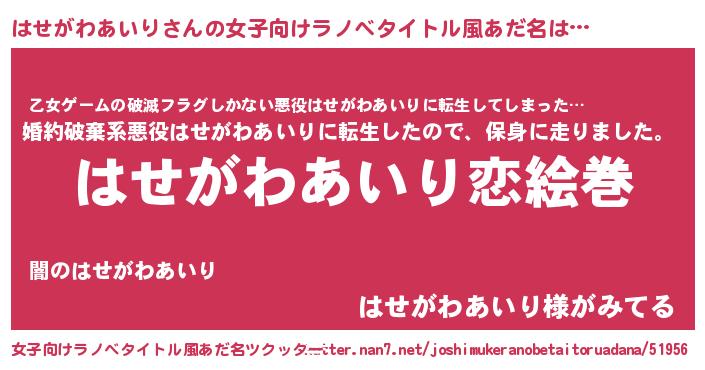 | 男性向けラノベタイトル風あだ名 | 『おまえをオタクにしてやるから、俺をはせがわあいりにしてくれ! 』 |