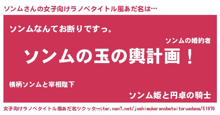 | 男性向けラノベタイトル風あだ名 | 『ソンム~年齢イコール彼女いない歴の魔法使い~』 |