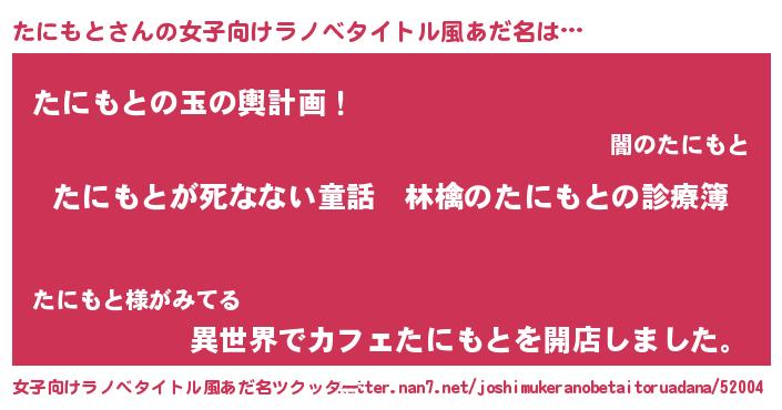 | 男性向けラノベタイトル風あだ名 | 『魔弾の王とたにもと』 |