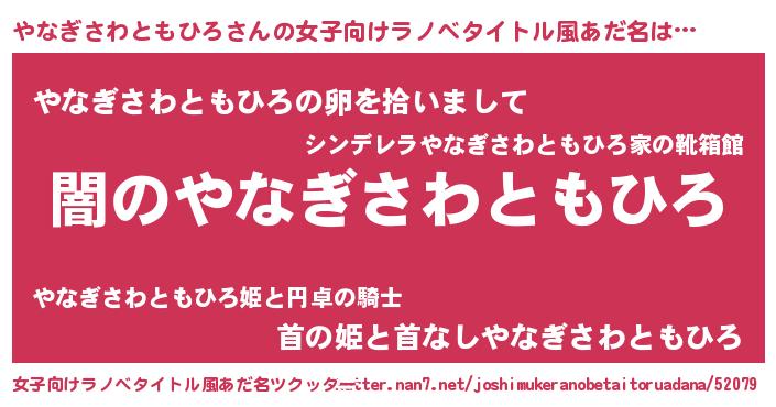 | 男性向けラノベタイトル風あだ名 | 『Re:やなぎさわともひろから始める異世界生活』 |