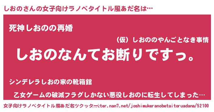| 男性向けラノベタイトル風あだ名 | 『魔法科高校のしおの』『しおのの憂鬱』 |