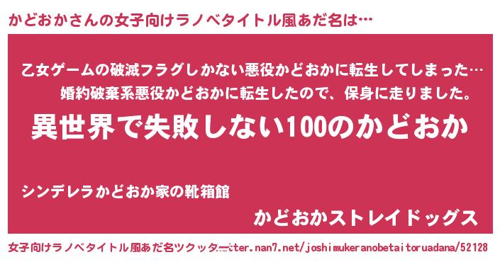 | 男性向けラノベタイトル風あだ名 | 『かどおかという概念が存在しない退屈な世界 』 |