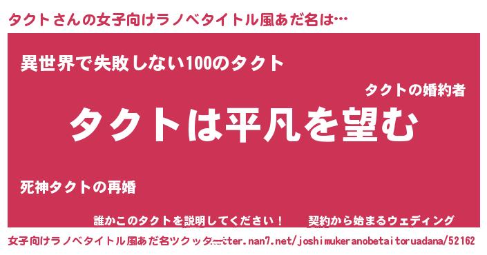 タクトさんの女子向けラノベタイトル風あだ名は… 『タクトは平凡を望む』『異世界で失敗しない100のタクト』『誰かこのタクトを説明してください! ~契約から始まるウェディング~』 ツクッター #女子向けラノベタイトル風あだ名ツクッター http://tkutter.nan7.net/joshimukeranobetaitoruadana/52162/