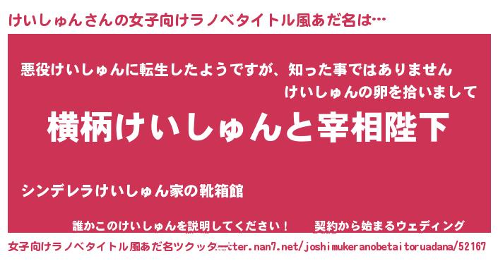 | 男性向けラノベタイトル風あだ名 | 『けいしゅんに滅ぼされるだけの簡単なお仕事です』 |